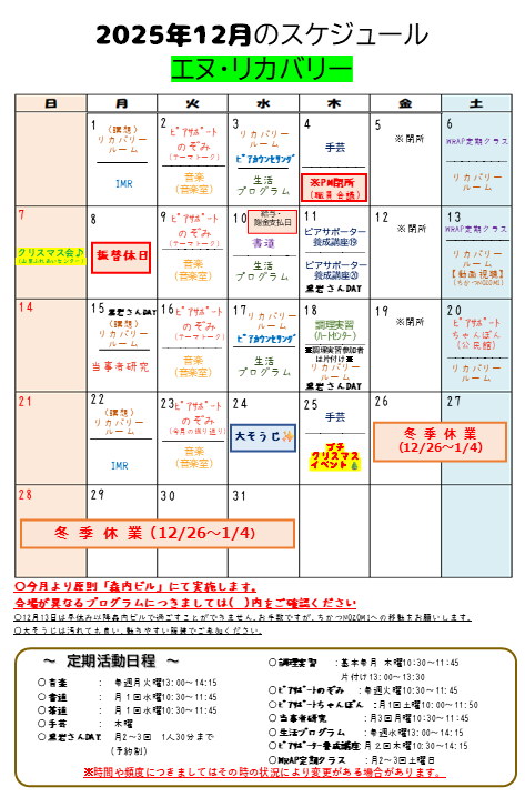 エヌ・リカバリーは、精神障害および発達障害をお持ちの方を主な対象とし、地域で健康的かつ文化的な生活を送るための「日中活動の場」を提供する生活訓練事業所です。