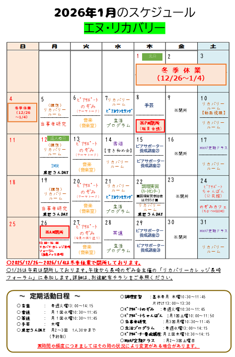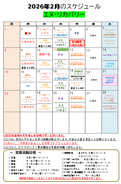 エヌ・リカバリーは、精神障害および発達障害をお持ちの方を主な対象とし、地域で健康的かつ文化的な生活を送るための「日中活動の場」を提供する生活訓練事業所です。